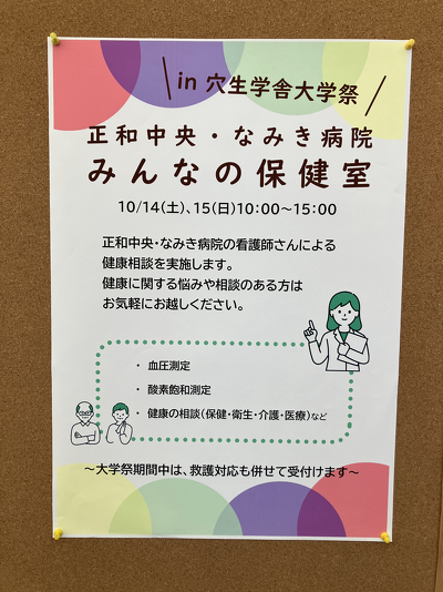 10月14日15日、2日間に渡って「穴生学舎大学祭」が開催されました。 しょうわ会からは「救護班」、「みんなの保健室」で参加しました。