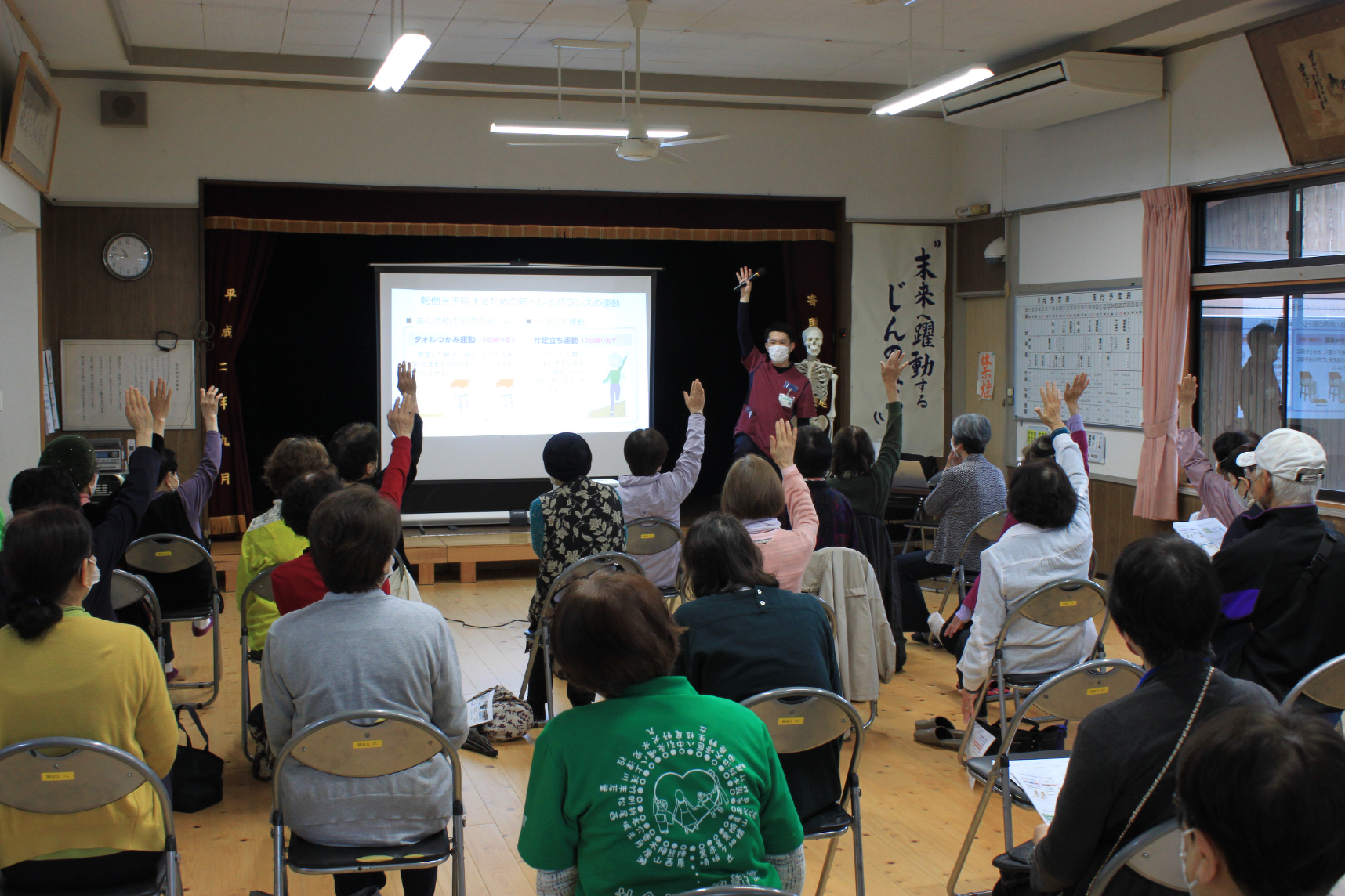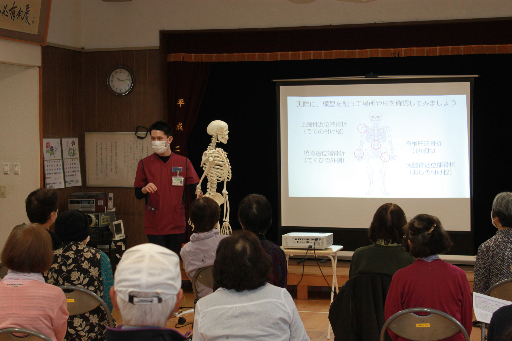 陣原地区社会福祉協議会主催の陣原ふれあいサロンに講師として参加しました。 2024.05.01(水) 陣原公民館において、『骨折を防ぐための身体づくりと生活のコツ』をテーマにリハビリテーション科の理学療法士が講師を務めました。当日は雨天での開催となりましたが、31名の方にご参加いただきました。