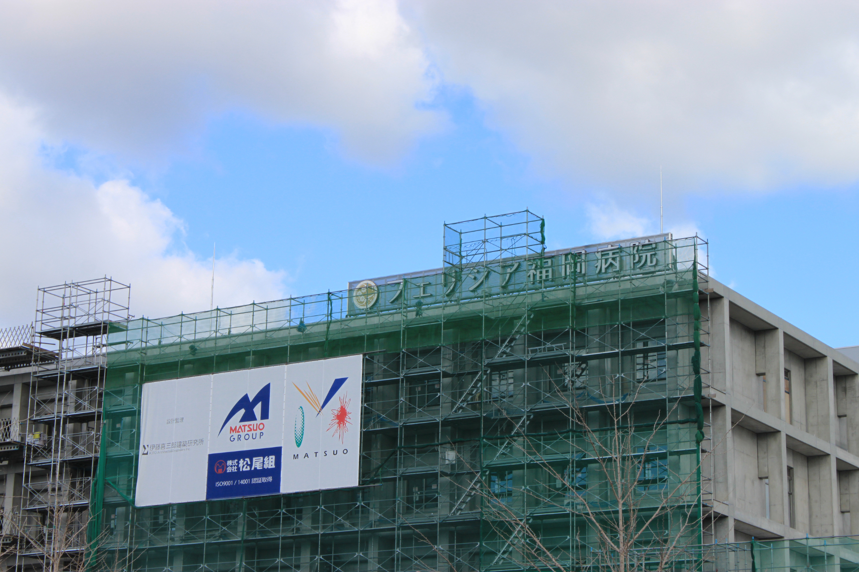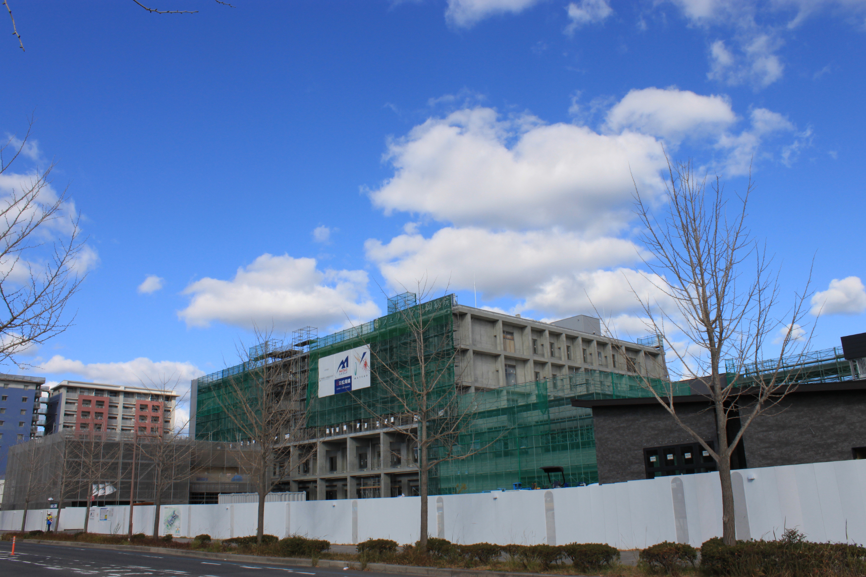 2024年12月23日現在の様子 2024.12.25(水) フェリシア福岡病院の建設工事の近況報告です。今月に入り、足場の解体を開始しております。それに伴い、外観の一部が見られるようになり、さらに、屋上にはフェリシア福岡病院のロゴと外部サインが設置されました。昨年の今頃は、地盤の基礎工事をしており、あっという間の一年でした。 地域の皆さまのご理解とご協力のおかげで一年を過ごすことができましたことを心よりお礼申し上げます。2025年になると、開院予定日まで残すところ『あと5か月』になります。無事に開院日を迎えられるよう気を引き締めて努めて参ります。