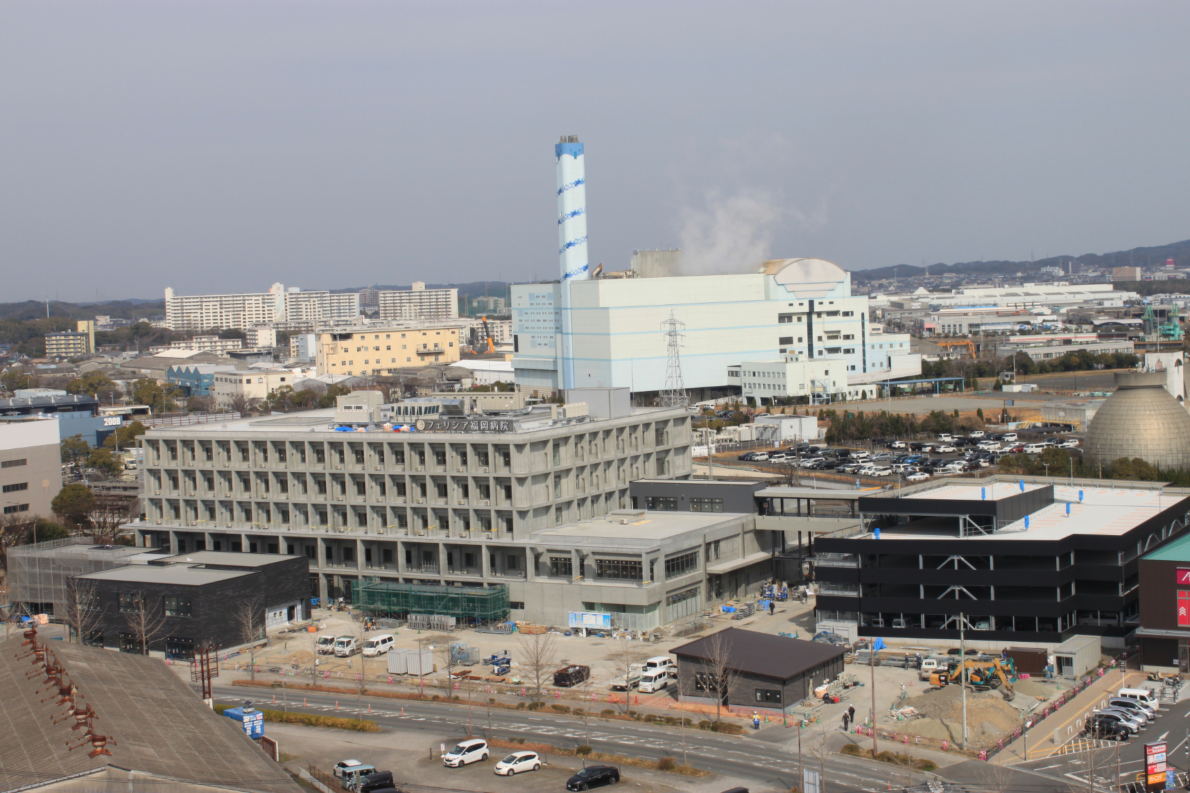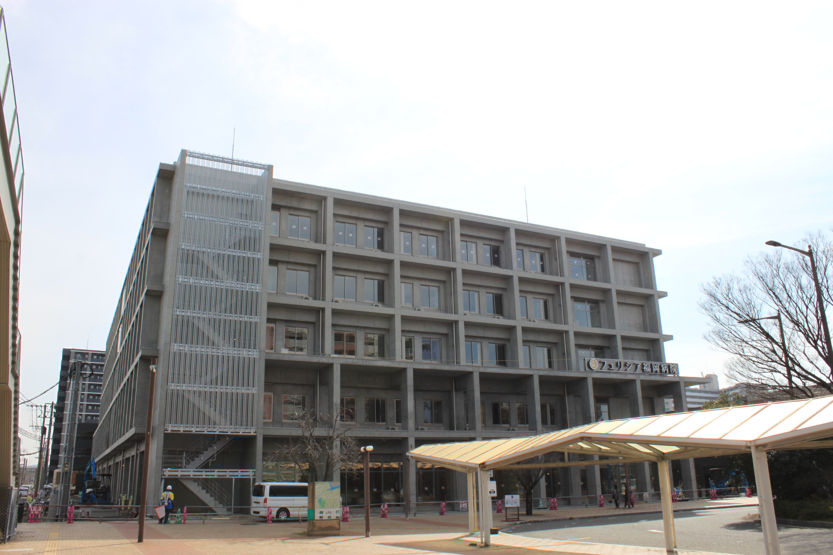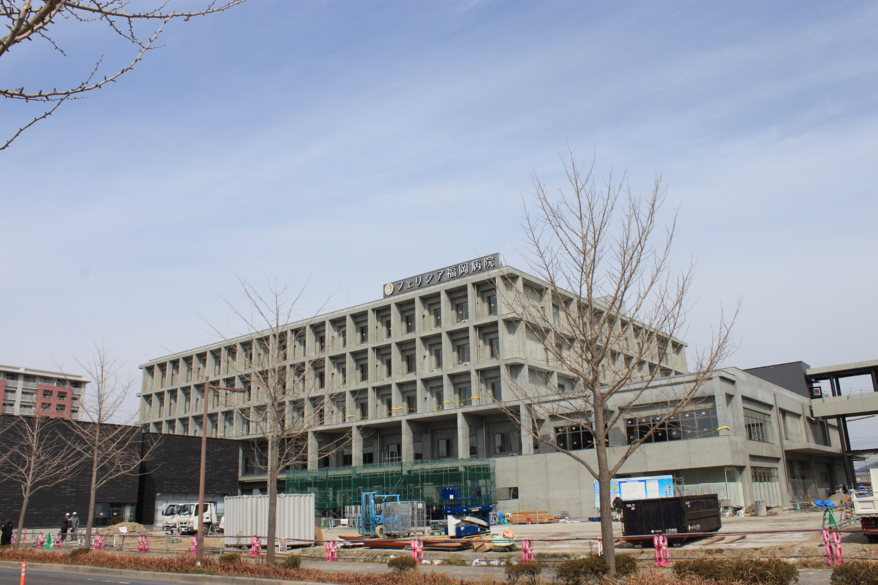 2025年2月27日現在の様子 2025.02.27(木) フェリシア福岡病院の建設工事の近況報告です。歩道沿いの囲いが撤去されはじめ、完成間近となっております。駅のロータリー側には最後の外部サインが設置され、「フェリシア福岡病院」外部サインがすべて揃いました。 そして、開院まで「あと94日」となりました。これから開院準備の大詰めとなりますが、職員一丸となって取り組んでいきます。